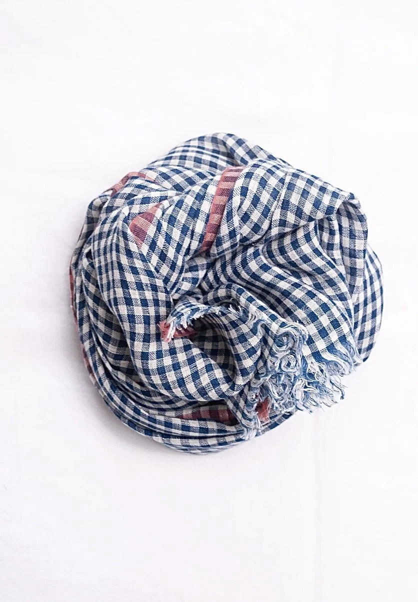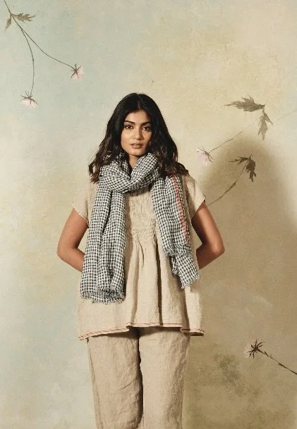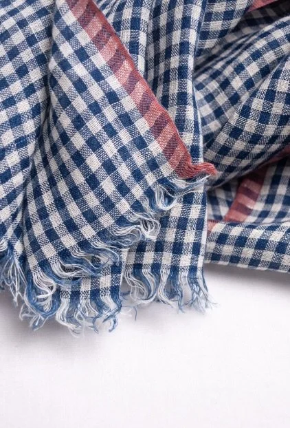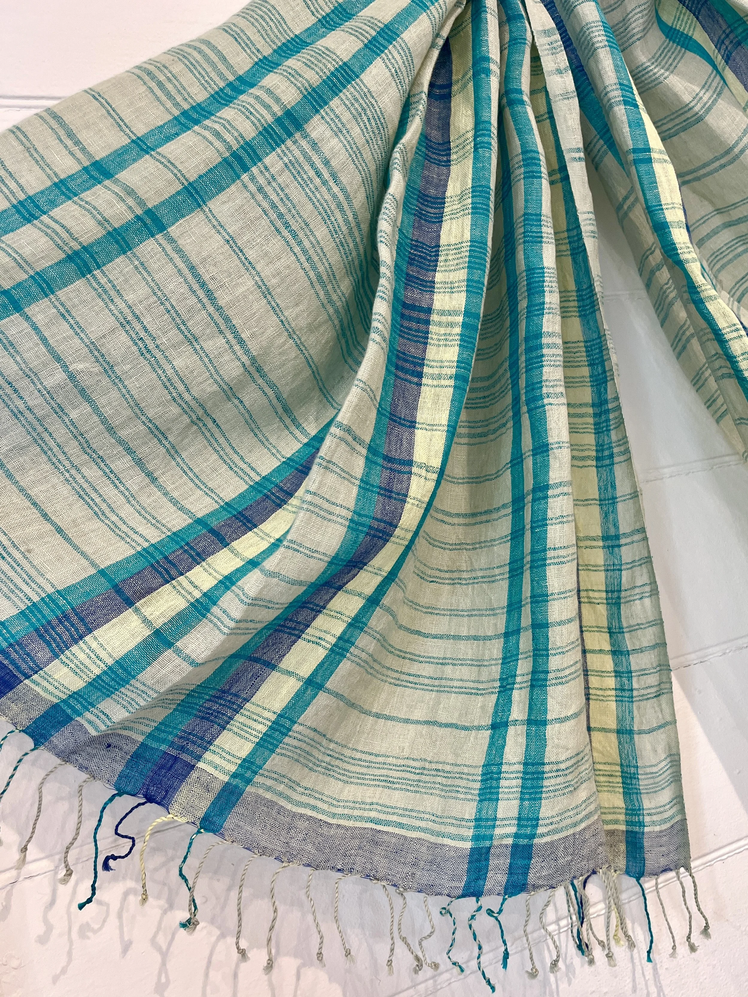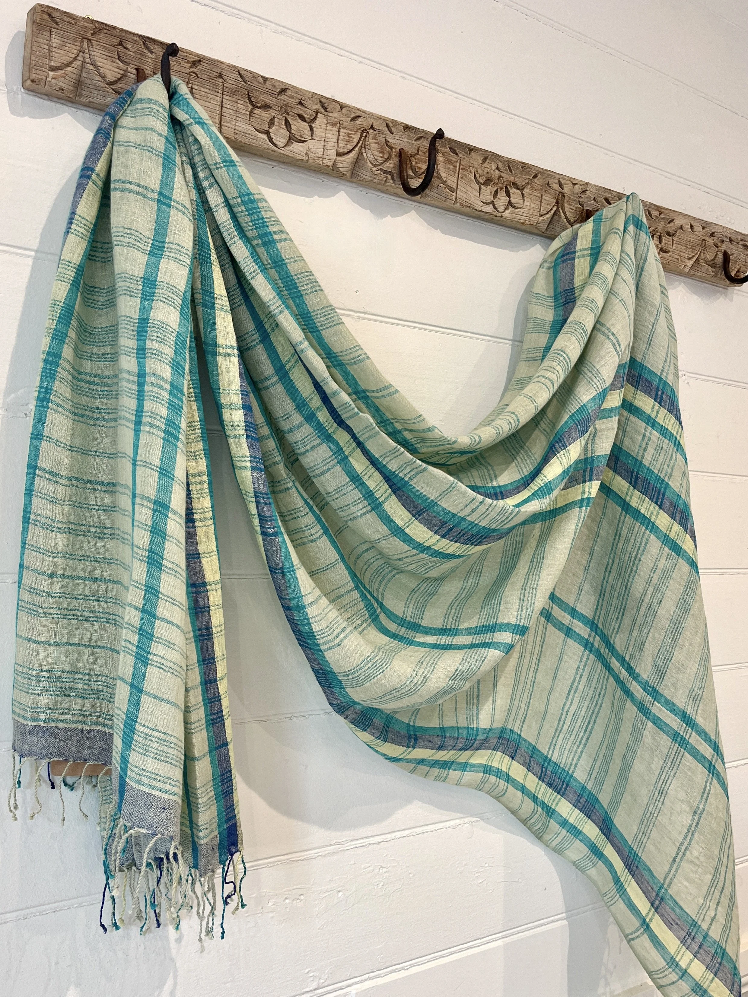 A lovely handwoven scarf with contrast check and stripe border on beautiful flowing linen. The perfect accessory to co-ordinate with your wardrobe all year round.